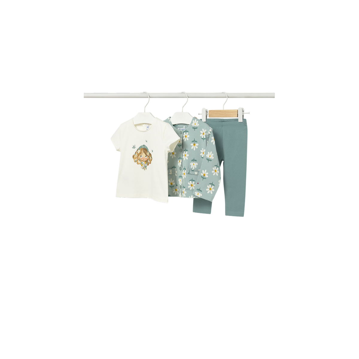 Conjunto infantil 3 piezas con chaqueta estampada de flores, legging liso a juego y camiseta blanca con dibujo central. Cómodo, versátil y perfecto para niñas que buscan estilo y libertad de movimiento en su día a día.