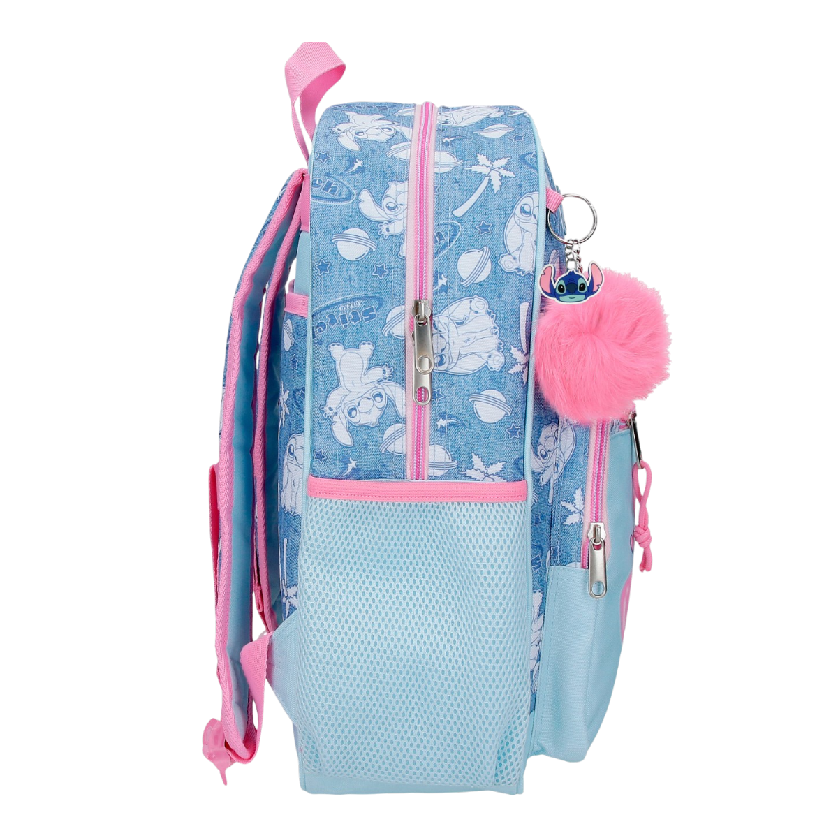 Dispone de un amplio compartimento principal con cierre de cremallera, ideal para libros, cuadernos y carpetas, además de un bolsillo frontal que facilita el acceso rápido a objetos más pequeños como estuches, agenda o accesorios. Sus laterales pueden utilizarse para botellas de agua u otros pequeños artículos.
