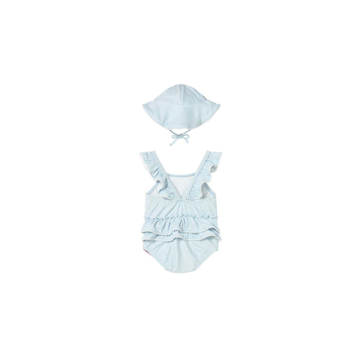 El gorro a juego completa el conjunto, proporcionando una mayor protección frente al sol y manteniendo una estética coordinada y cuidada. Es perfecto para días de playa o piscina, permitiendo libertad de movimiento para jugar y disfrutar sin preocupaciones.
