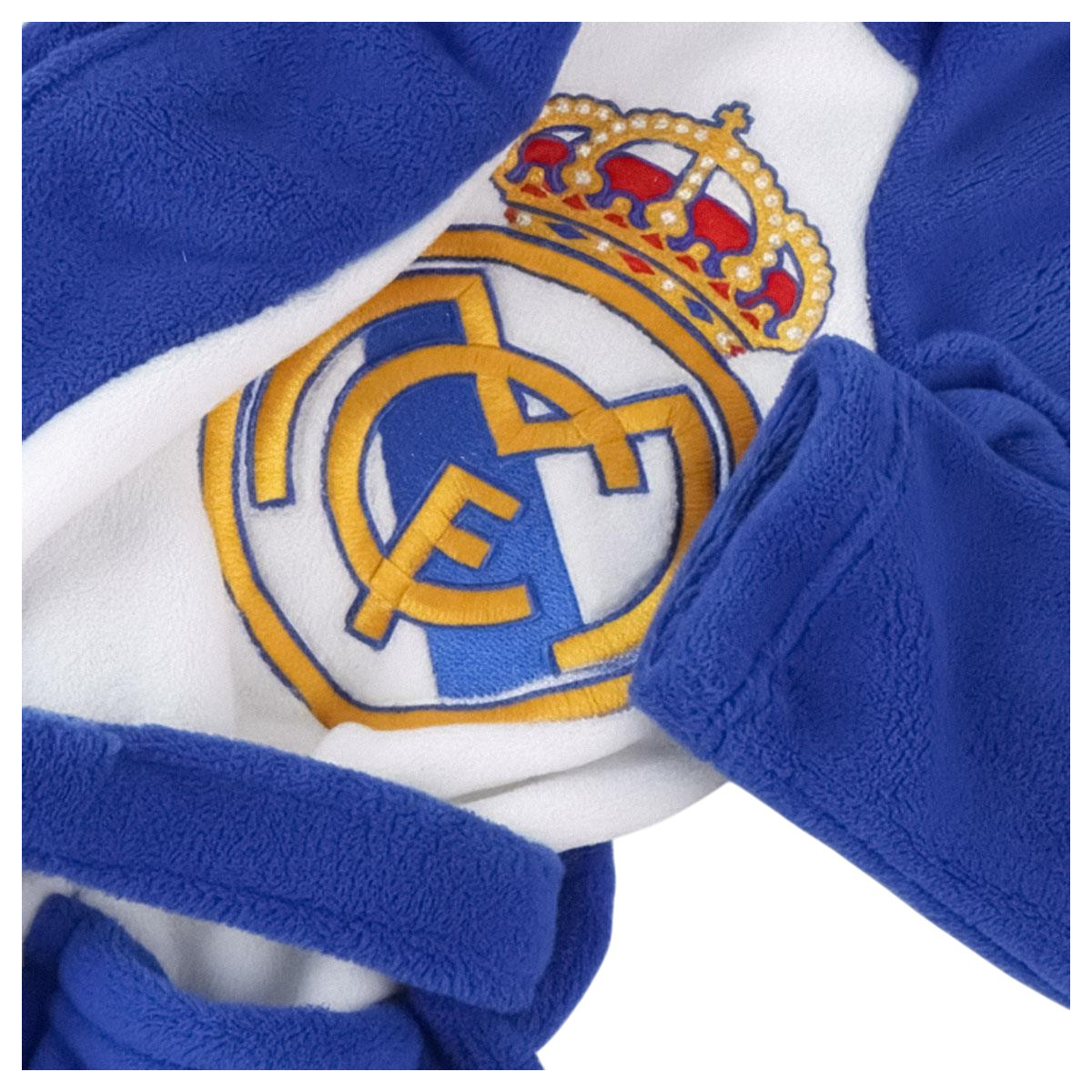 Bata oficial del Real Madrid confeccionada en suave coralina, ideal para los días fríos. Su diseño incluye aplicaciones del escudo del club y detalles que muestran el orgullo madridista. Cálida, cómoda y perfecta para los verdaderos aficionados.