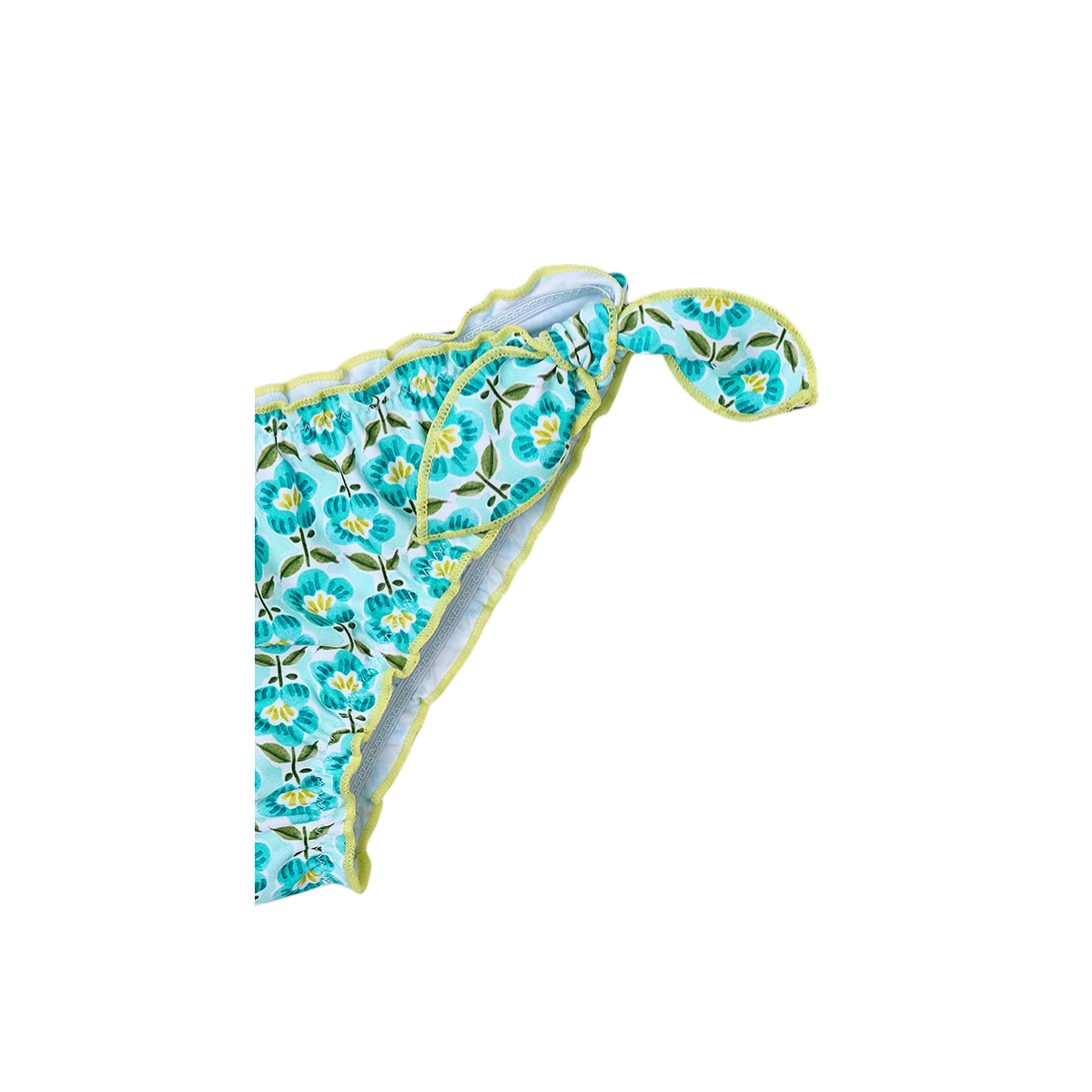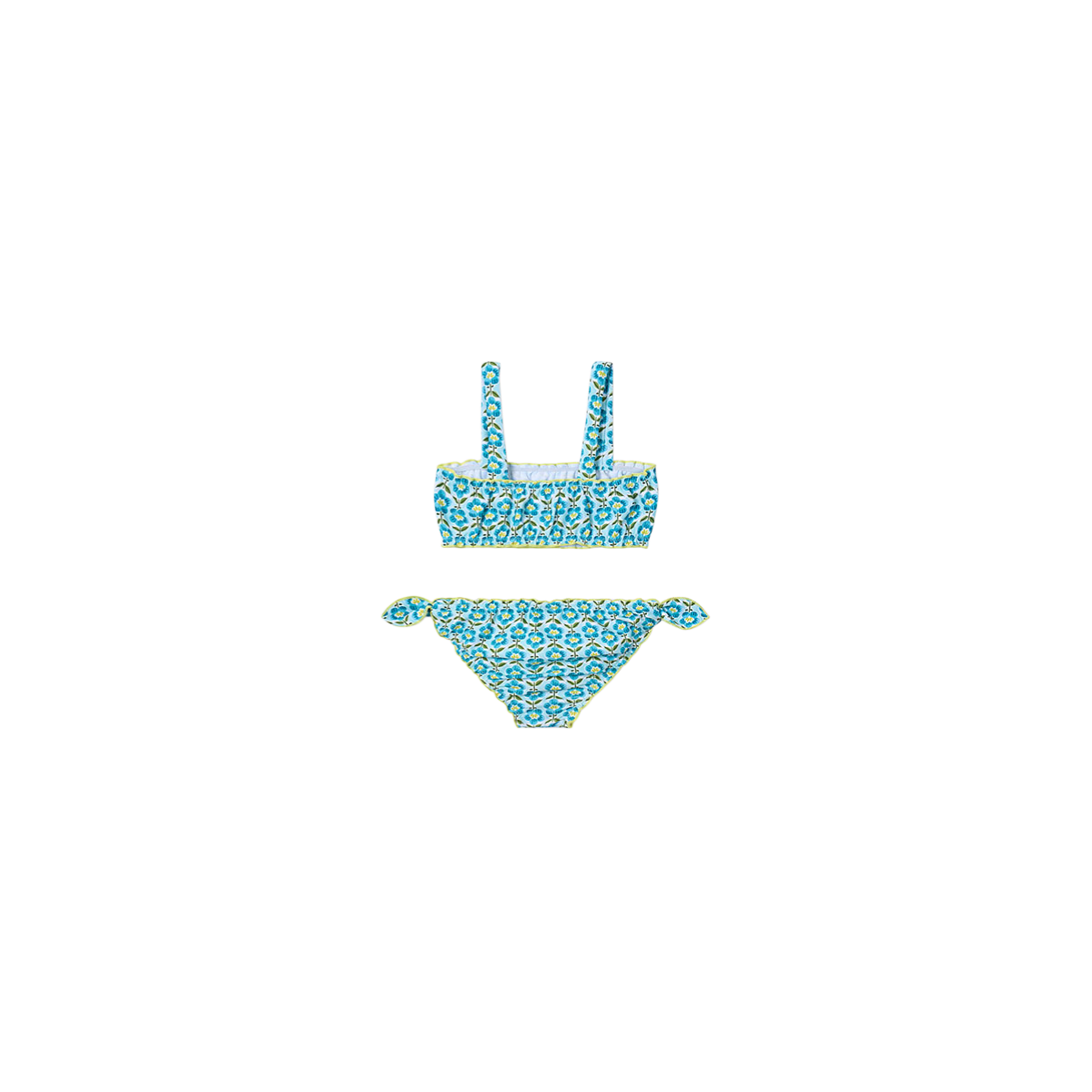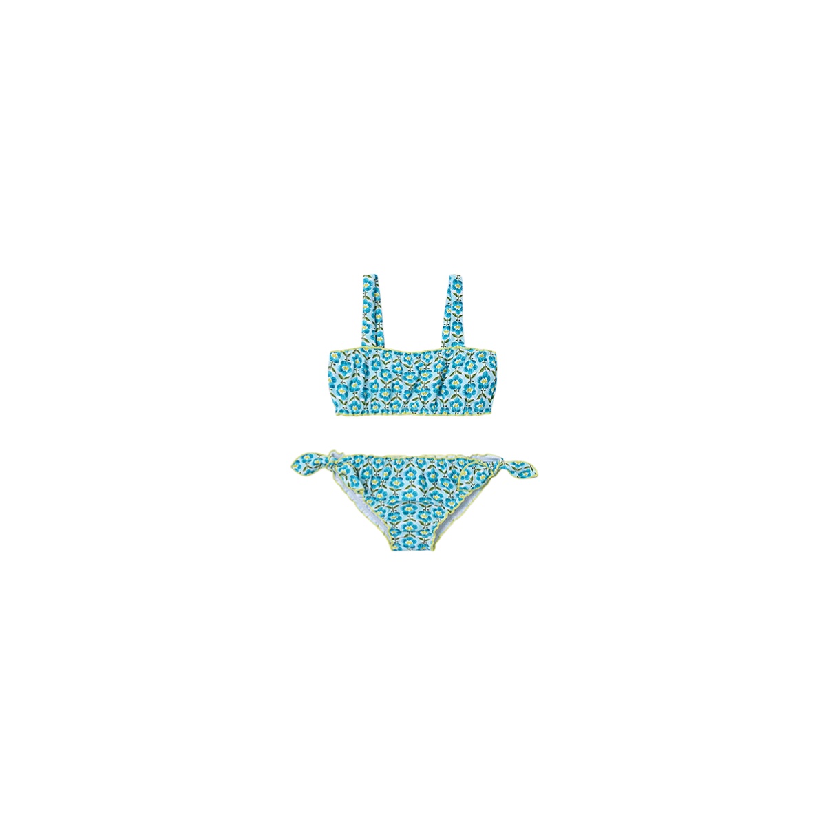 Bikini infantil con estampado floral en tonos azul, verde y amarillo, alegre, cómodo y perfecto para disfrutar del verano en playa o piscina.