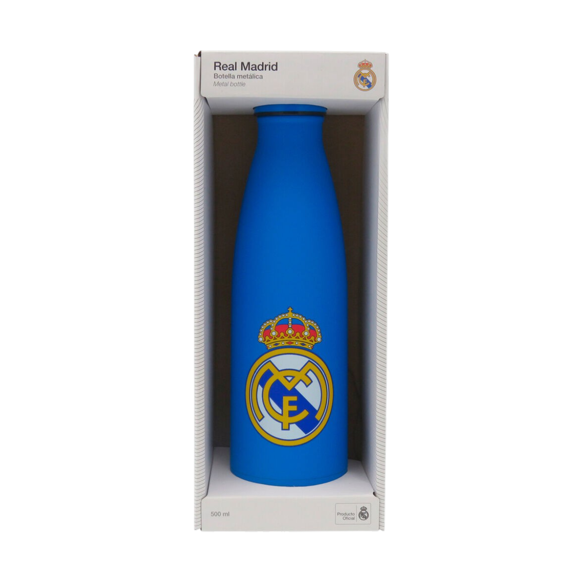 Botella de acero inoxidable de 500 ml del Real Madrid, resistente y reutilizable, perfecta para mantener tus bebidas siempre a mano con estilo deportivo.