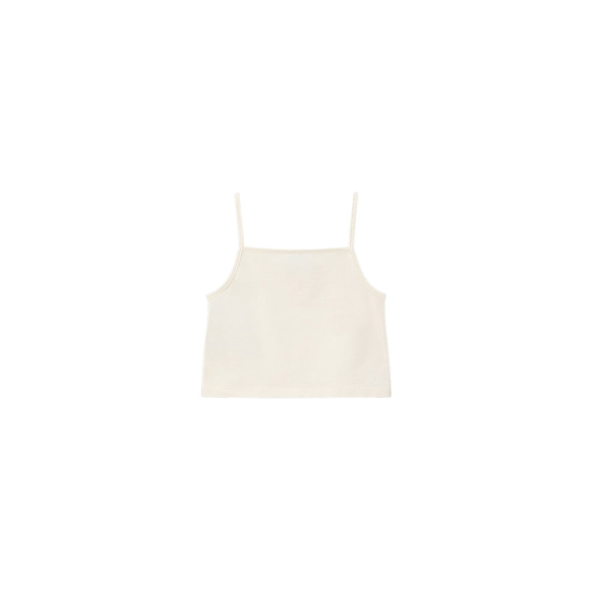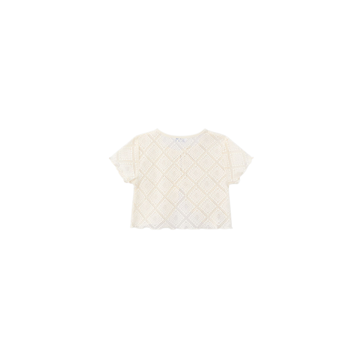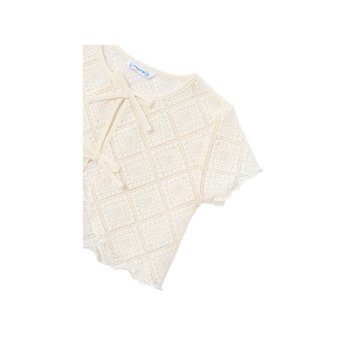 Camiseta infantil de 2 piezas en tono beige, con top de tirantes liso y sobrecamiseta de manga corta con crochet y lazos frontales. Un conjunto fresco, elegante y perfecto para el verano.