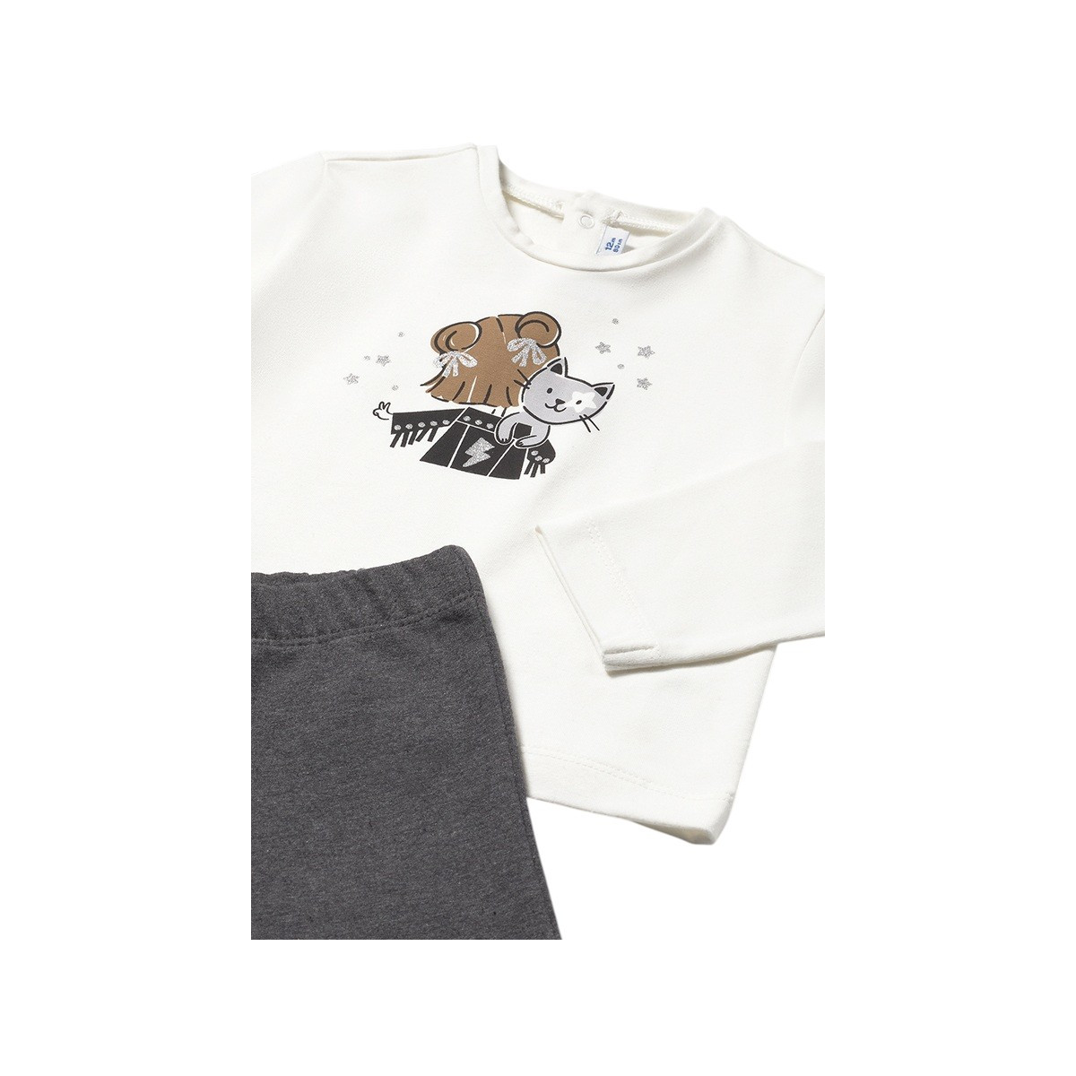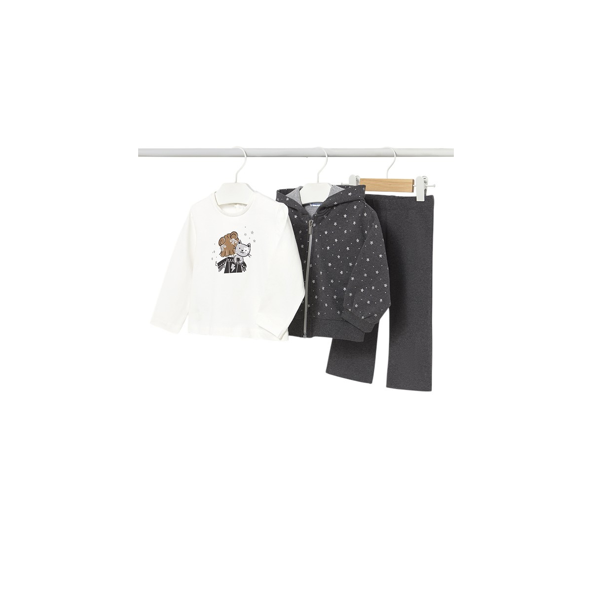 Chándal para bebé niña de Mayoral compuesto por sudadera con cremallera, pantalón a juego y camiseta de manga larga. Un conjunto completo, cómodo y práctico para el día a día con el estilo divertido y de calidad que caracteriza a la marca.