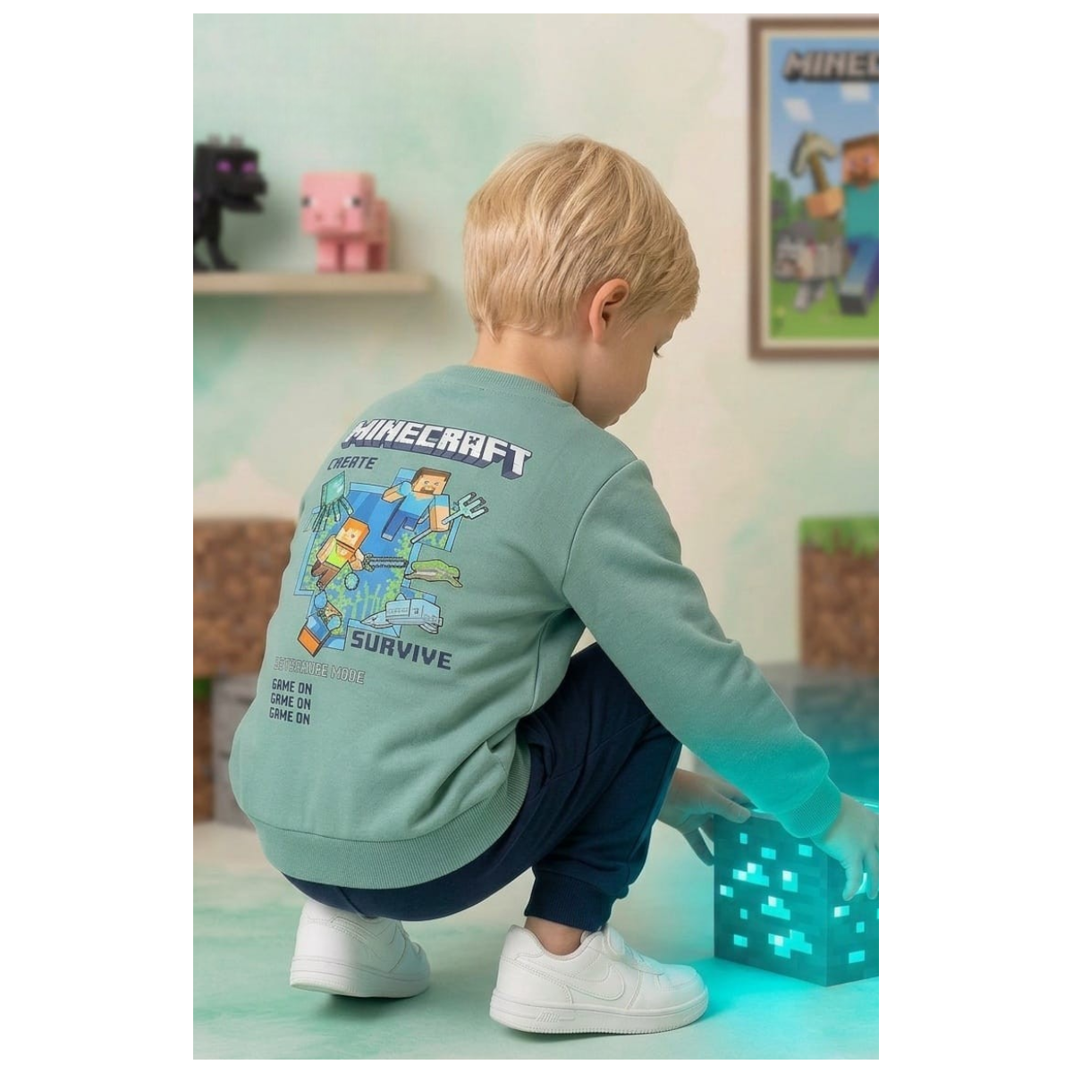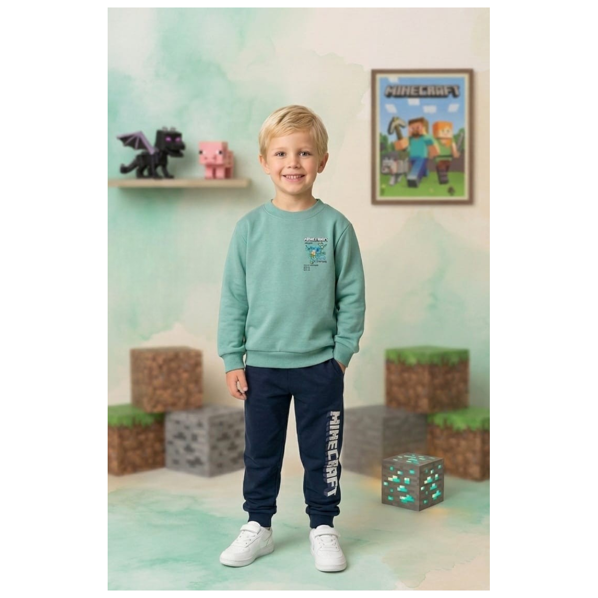 Conjunto chándal infantil de Minecraft compuesto por sudadera verde y pantalón azul marino, perfecto para niños fans del famoso videojuego. Un outfit cómodo, moderno y resistente, ideal para el colegio, actividades diarias o momentos de juego.