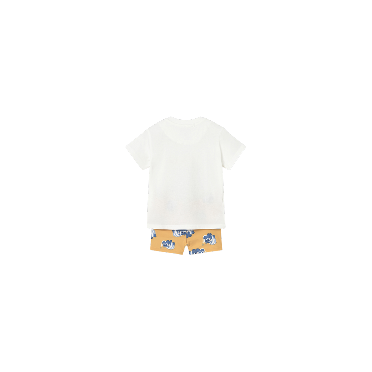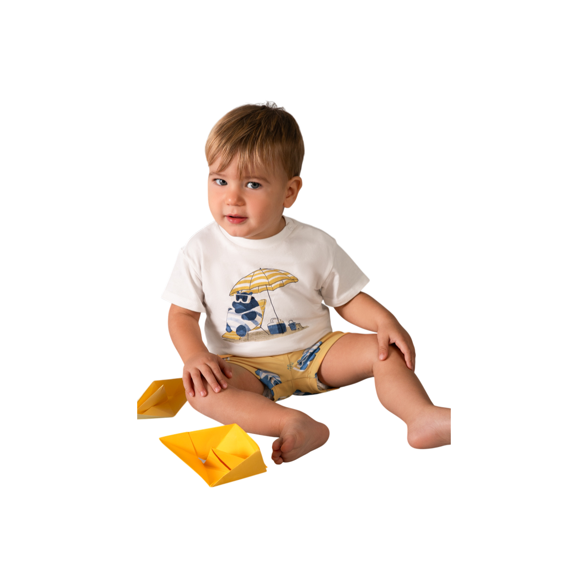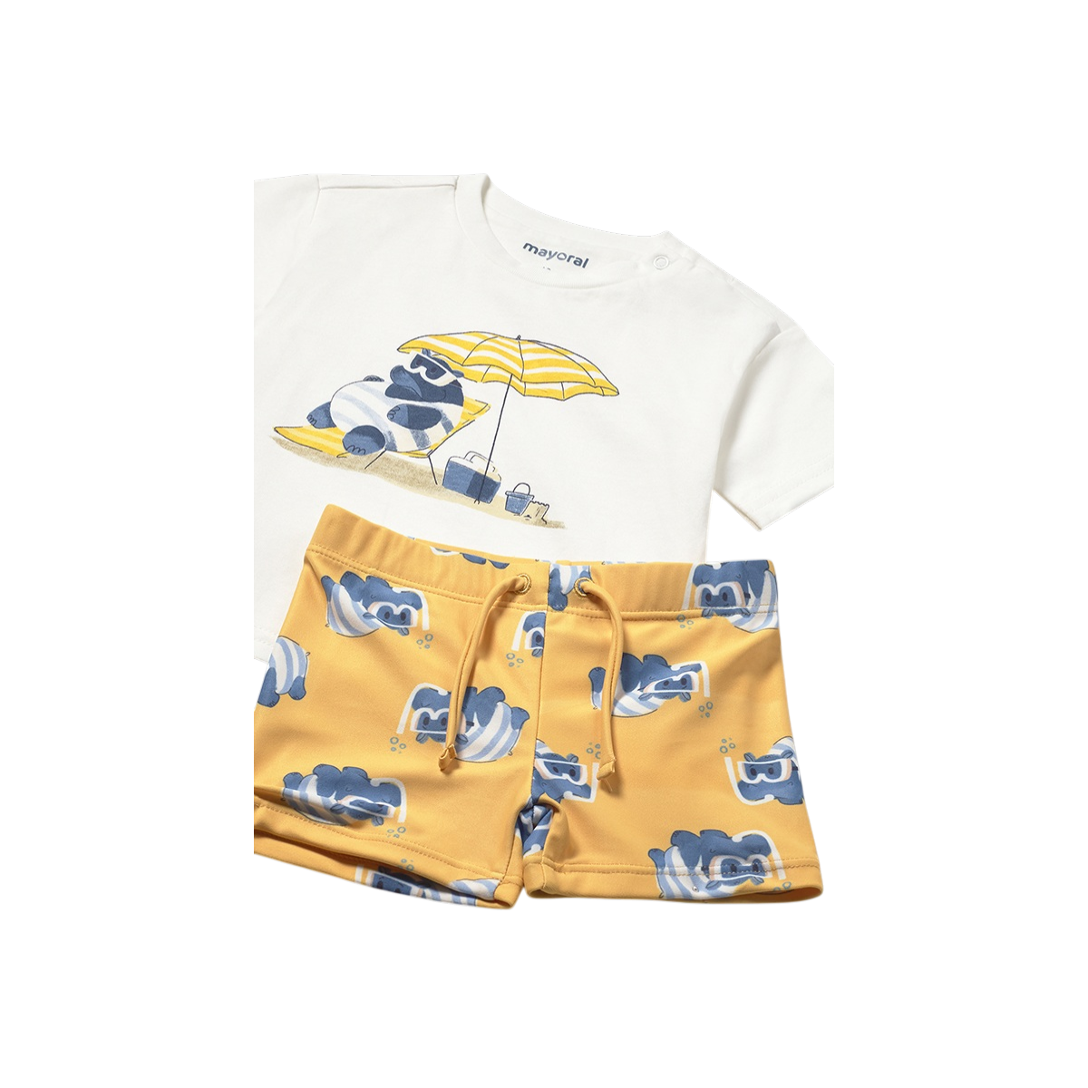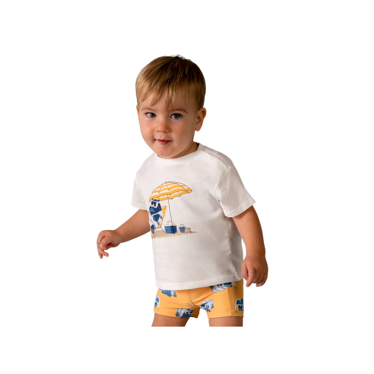 Conjunto de baño infantil con camiseta blanca con dibujo frontal y bañador amarillo estampado, cómodo y divertido. Perfecto para que los más pequeños disfruten del agua con estilo y total libertad de movimiento.