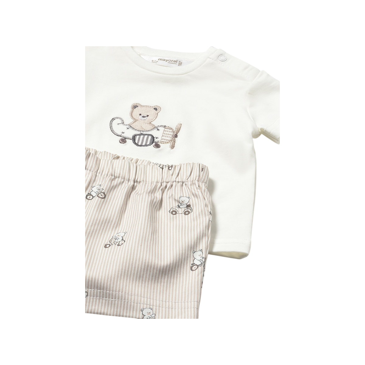 Conjunto infantil de pantalón corto y camiseta con diseño de ositos, ideal para verano. El pantalón a rayas en tonos blanco y beige con estampado de ositos combina a la perfección con la camiseta blanca con dibujo frontal a juego, ofreciendo un look cómodo, fresco y adorable para los más pequeños.