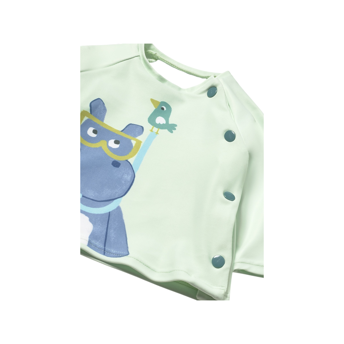 Conjunto de baño infantil en color verde pastel con pantalón estampado de hipopótamos, camiseta con dibujo frontal y gorro a juego. Cómodo, divertido y perfecto para verano.