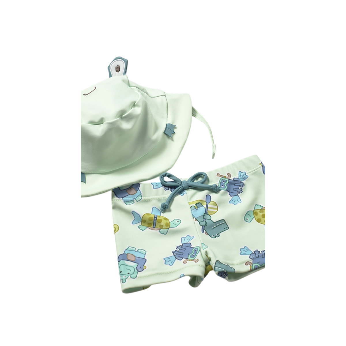 Este conjunto de baño infantil en tono verde pastel es ideal para que los más pequeños disfruten del verano con estilo y comodidad. Incluye un pantalón de baño con estampado de hipopótamos, una camiseta con dibujo en la parte delantera y un gorro a juego que completa el look.