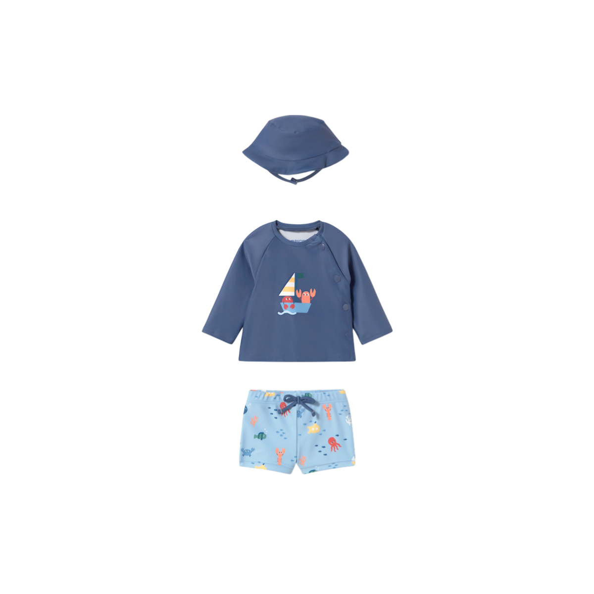 Este conjunto de baño infantil en color azul está diseñado para acompañar a los más pequeños en sus aventuras de verano. Incluye un pantalón de baño con estampado de animales marinos, una camiseta con dibujo frontal de un velero y un gorro a juego que completa el conjunto.