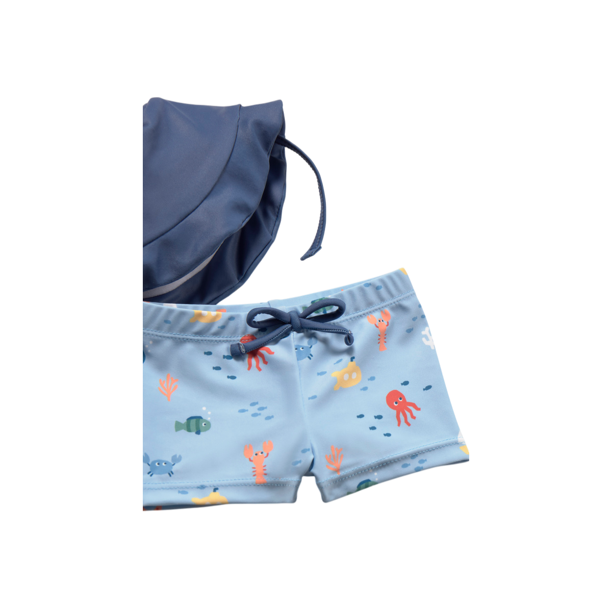 Conjunto de baño infantil en color azul con estampado de animales del mar, camiseta con dibujo de velero y gorro a juego. Fresco, cómodo y perfecto para verano.