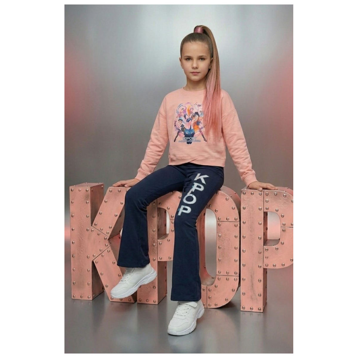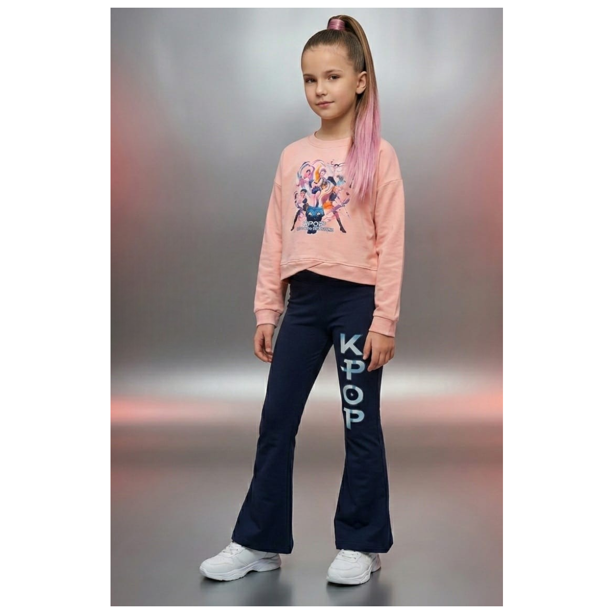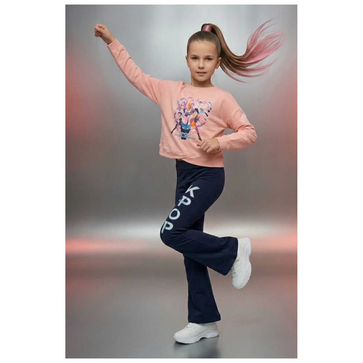 La sudadera rosa destaca por su estampado colorido y moderno, mientras que el legging oscuro aporta contraste y estilo con las icónicas letras K-POP, haciendo de este conjunto una opción perfecta para actividades diarias, colegio o salidas.