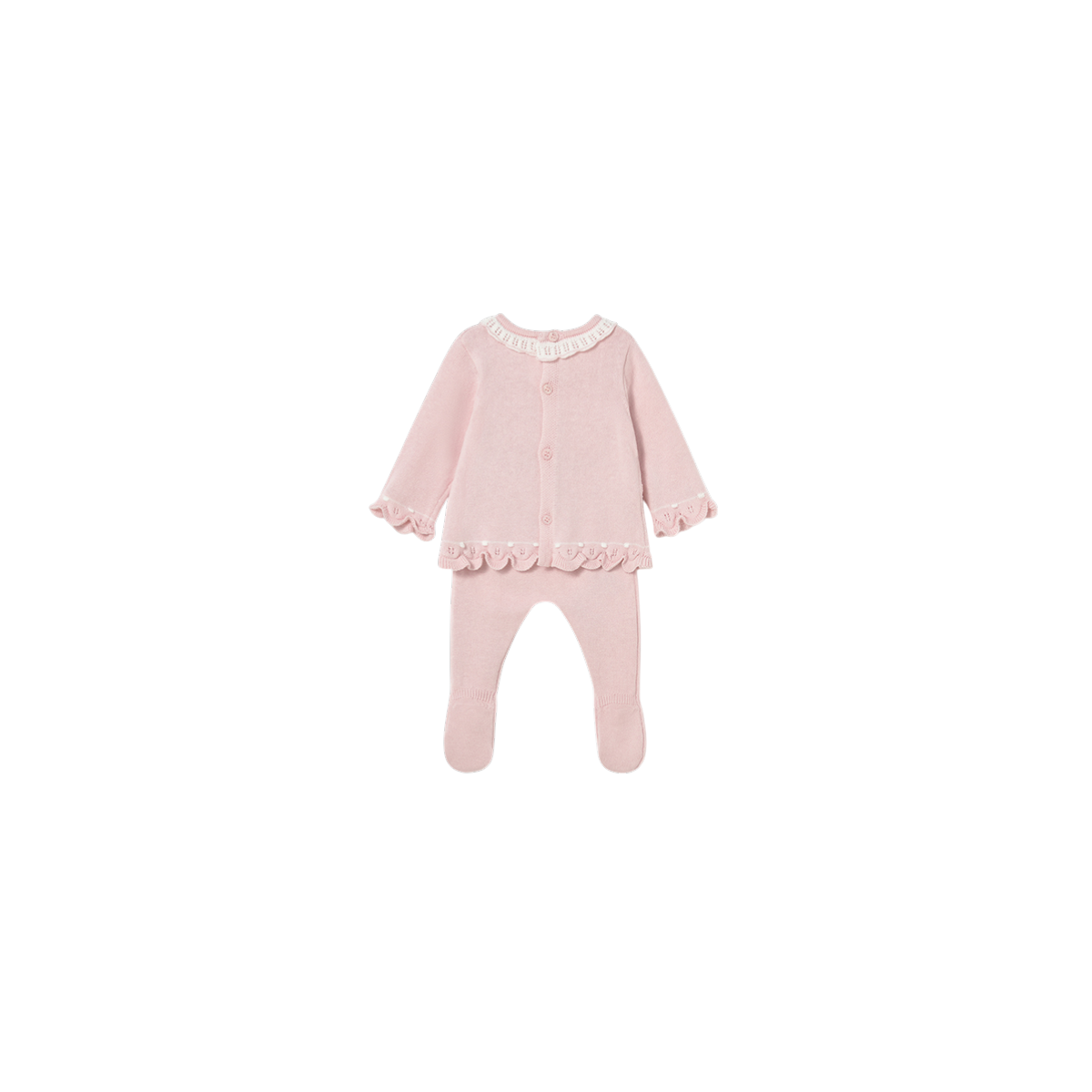 Conjunto para recién nacida de la marca Mayoral, compuesto por jersey de tricot y polaina en color rosa, ideal como primera puesta. Diseño delicado, cómodo y perfecto para los primeros días del bebé.
