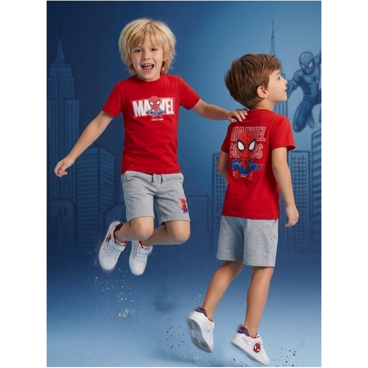 El conjunto de Spider-Man es una opción ideal para niños que quieren vestir con estilo y comodidad. Incluye una camiseta de manga corta en color rojo con estampado frontal del personaje, además de un diseño trasero llamativo, aportando un look completo y original.