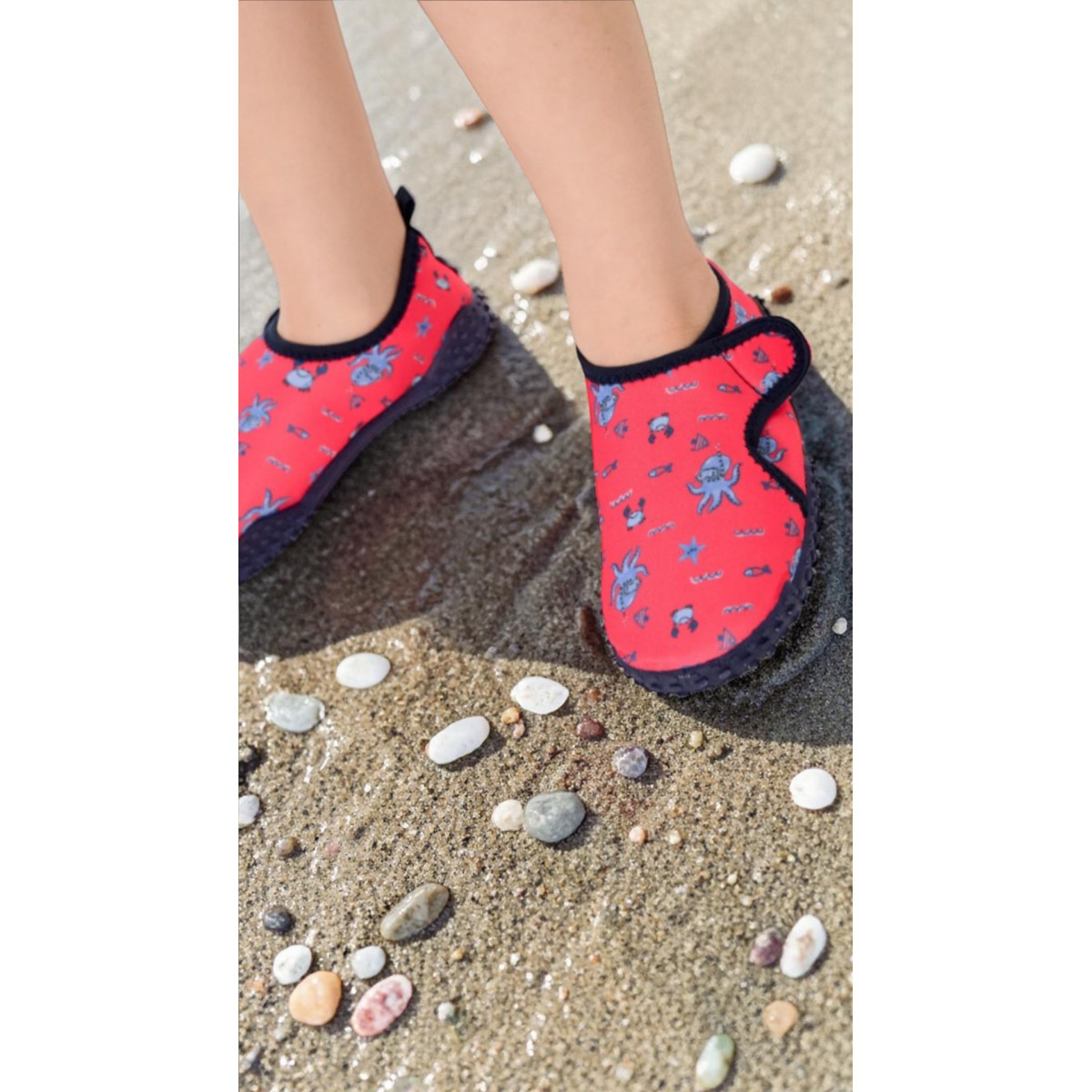 Escarpines de bebé en color rojo con estampado de animales marinos, cómodos, ligeros y perfectos para proteger los pies en playa o piscina.