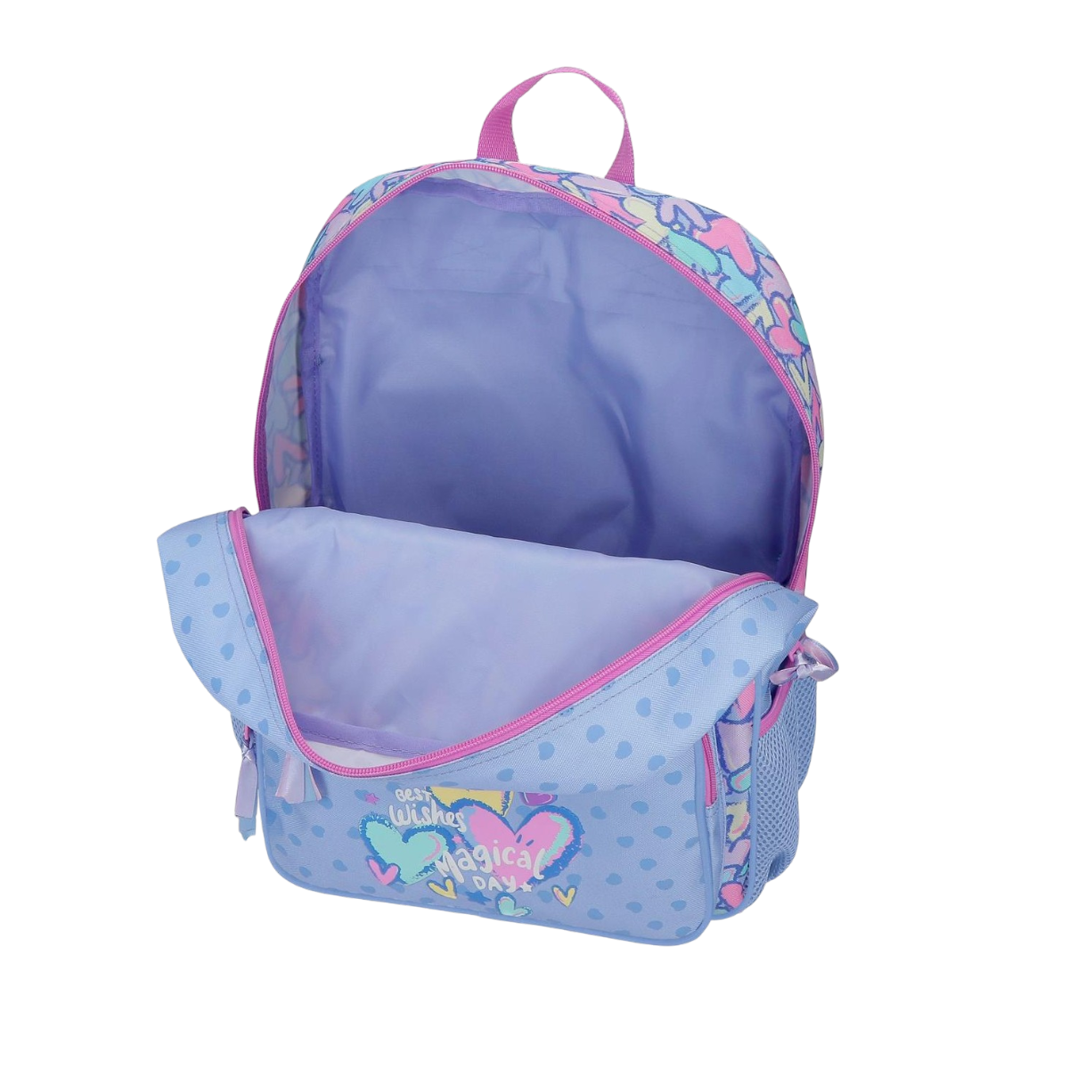 Mochila Best Wishes de 38 cm con diseño en tonos pastel y corazones, perfecta para el colegio o uso diario. Cómoda, resistente y con gran capacidad para llevar todo lo necesario.