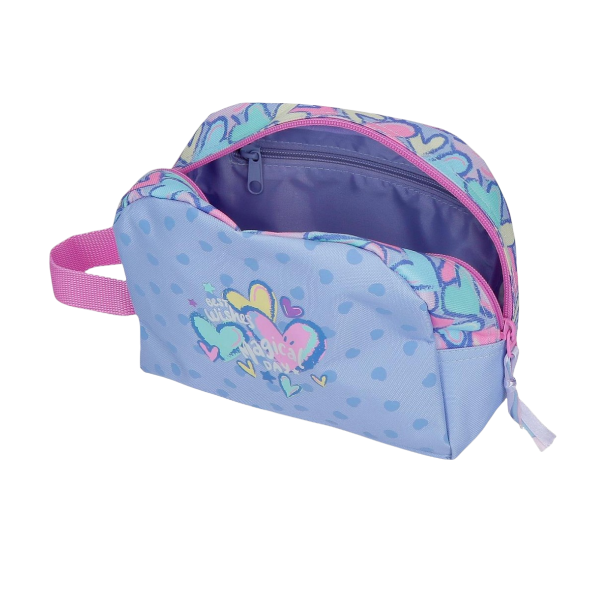 Neceser Best Wishes de diseño alegre y juvenil en tonos pastel, ideal para organizar productos de higiene, maquillaje o accesorios. Compacto, ligero y práctico para el día a día, viajes o colegio.