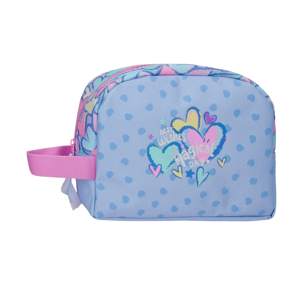 El neceser Best Wishes es el complemento perfecto para mantener organizados todos los imprescindibles de forma cómoda y con estilo. Su diseño en color azul claro con estampado de lunares y corazones multicolor transmite un aire dulce y moderno, ideal para niñas, adolescentes o amantes de los accesorios originales.