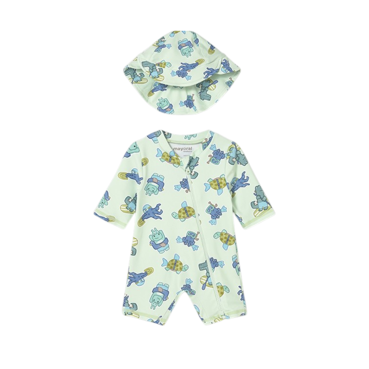 Pelele de baño con gorro y protección solar para recién nacido, ideal para disfrutar del agua con seguridad, comodidad y estilo durante el verano.