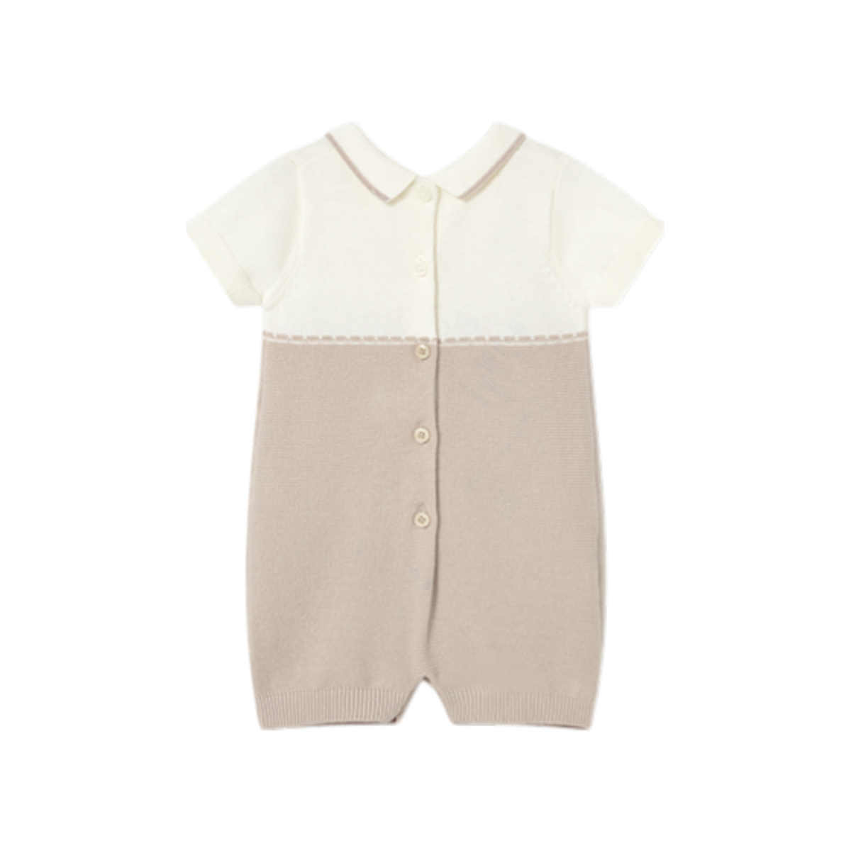 Pelele de tricot para bebé de la marca Mayoral, con elegante cuello en dos tonos de beige. Una prenda cómoda, suave y perfecta para los primeros meses del bebé, ideal como primera puesta o regalo.