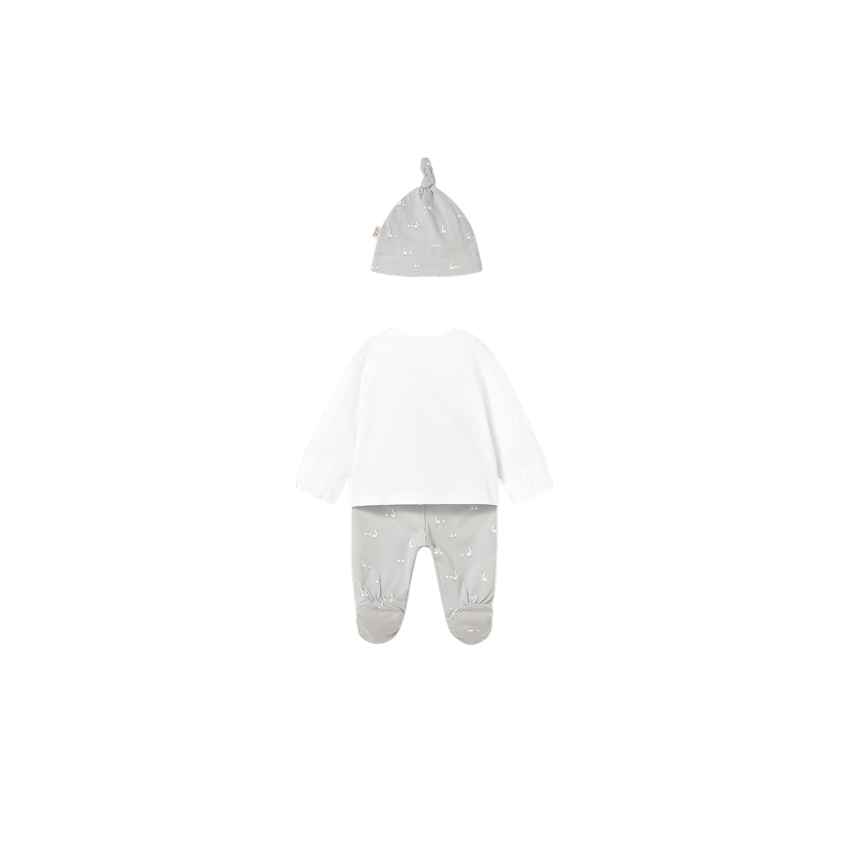 Set regalo en tonos grises para recién nacido de la marca Mayoral, ideal como primera puesta o regalo de nacimiento. Incluye conjunto con polaina y gorro, diseñado para ofrecer máxima comodidad, suavidad y estilo desde los primeros días de vida del bebé.