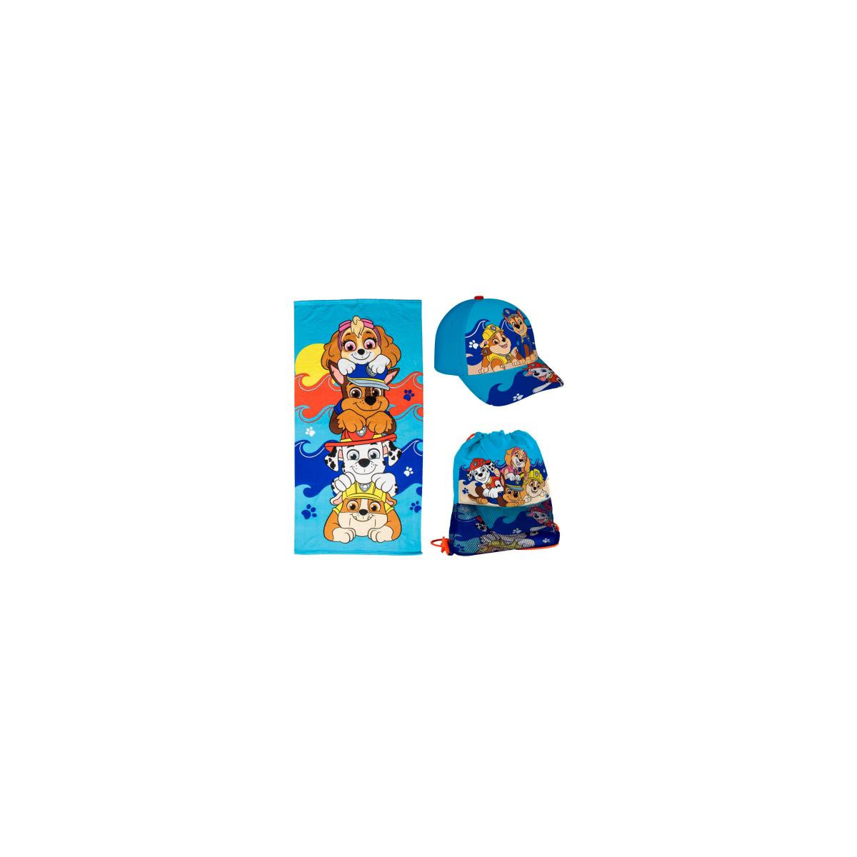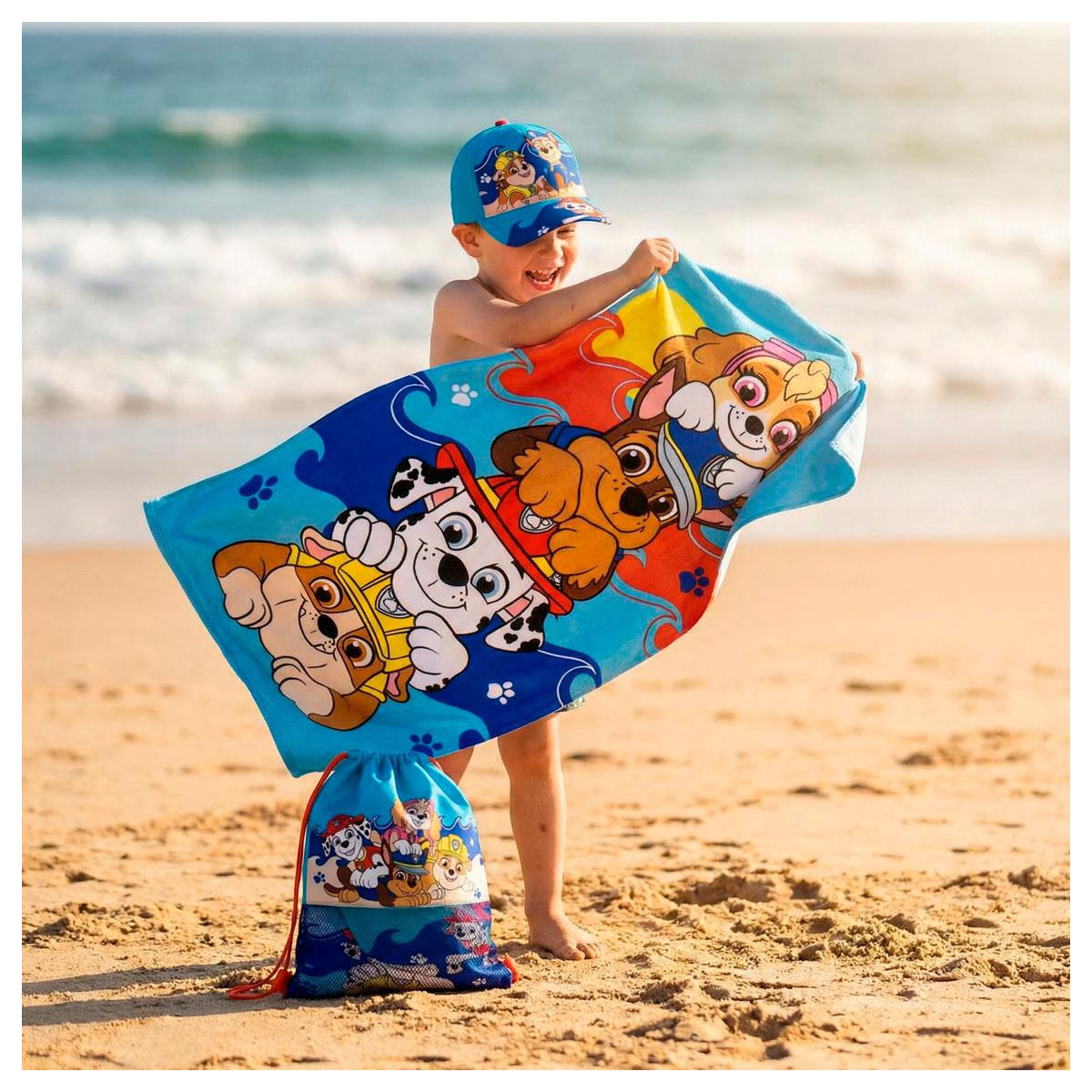 Completo set infantil de toalla, saquito y gorra de Paw Patrol, ideal para acompañar a los peques en la playa o piscina con todo lo necesario. Práctico, cómodo y con un diseño divertido de sus personajes favoritos.