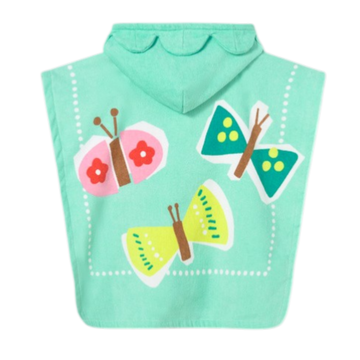Toalla infantil con capucha en color verde agua y estampado de mariposas de colores. Suave, absorbente y perfecta para playa o piscina.