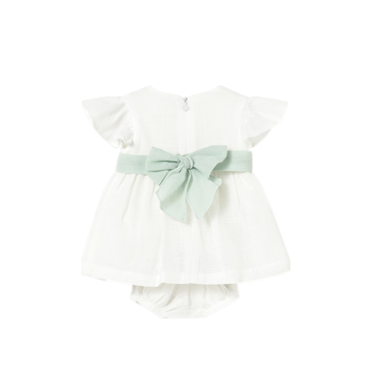 Vestido Mayoral de ceremonia para recién nacida con cubrepañal y delicado fajín floral, ideal para bautizos, celebraciones y ocasiones especiales. Elegante, cómodo y perfecto para los primeros meses.