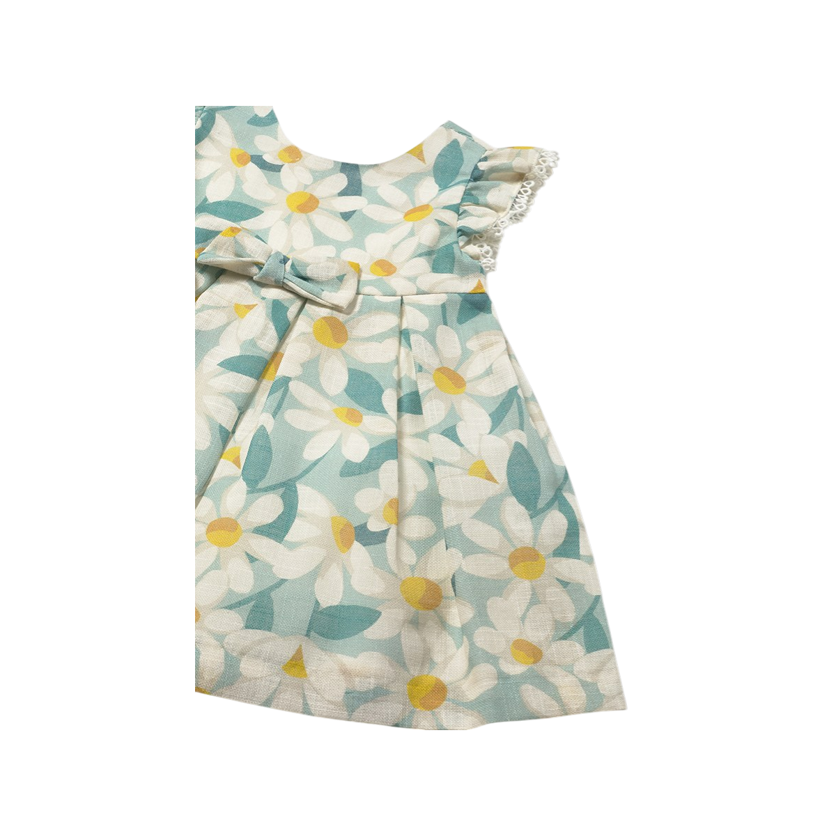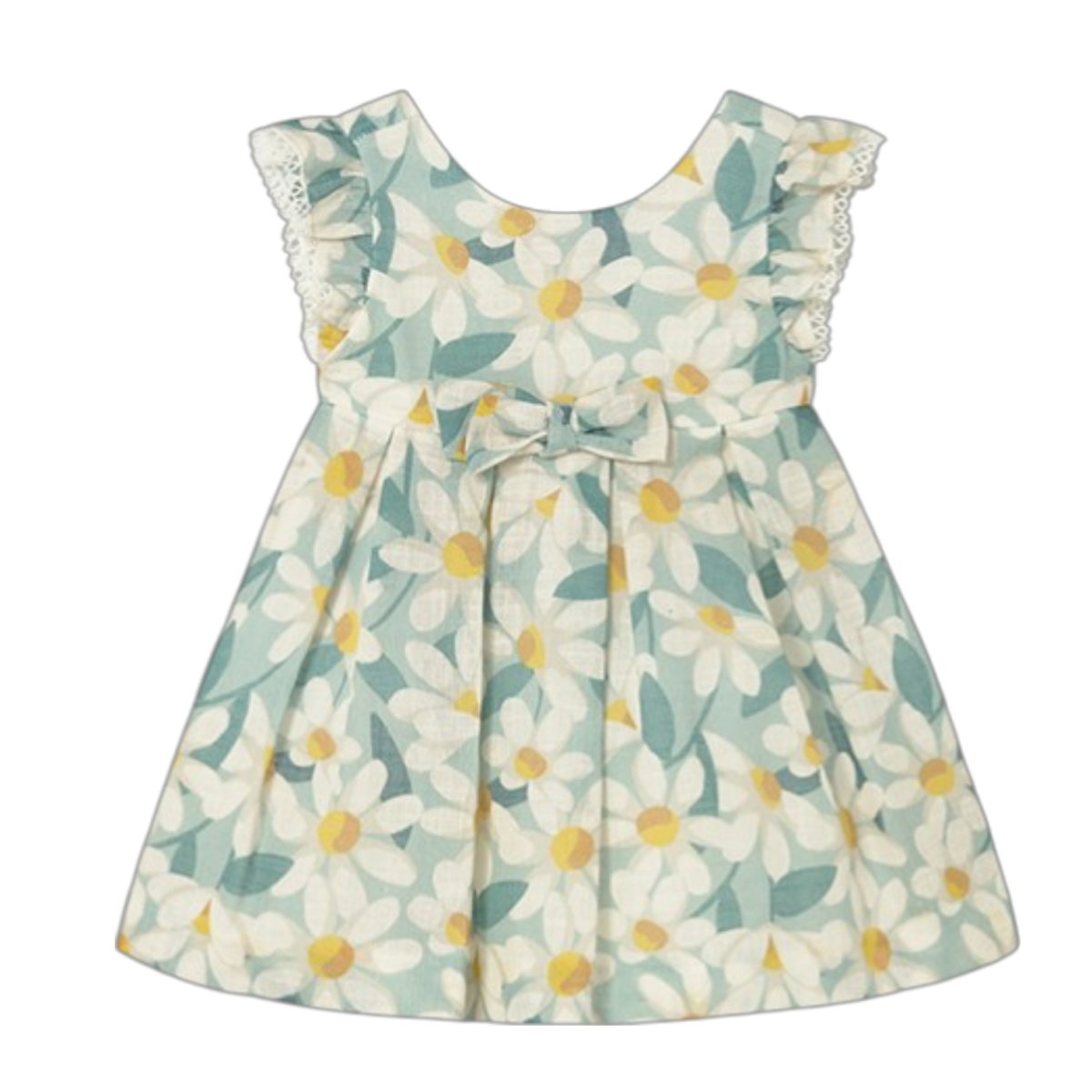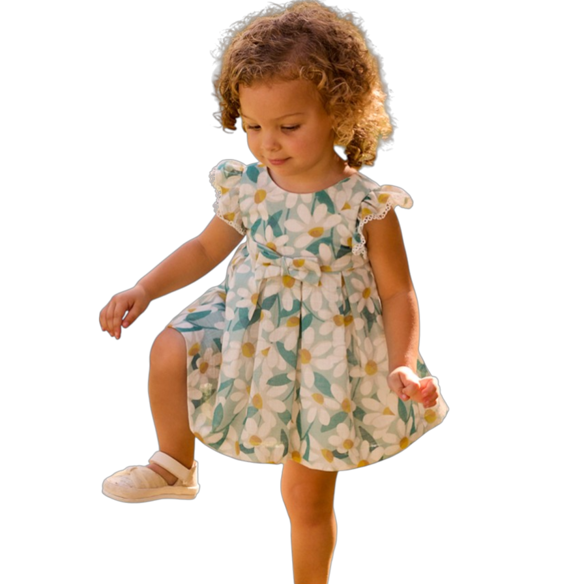 Este encantador vestido infantil de Mayoral destaca por su delicado estampado de margaritas en tonos suaves, perfecto para los días cálidos. Su diseño combina un fondo en color verde agua con flores blancas y detalles amarillos, aportando un estilo dulce, veraniego y muy actual.