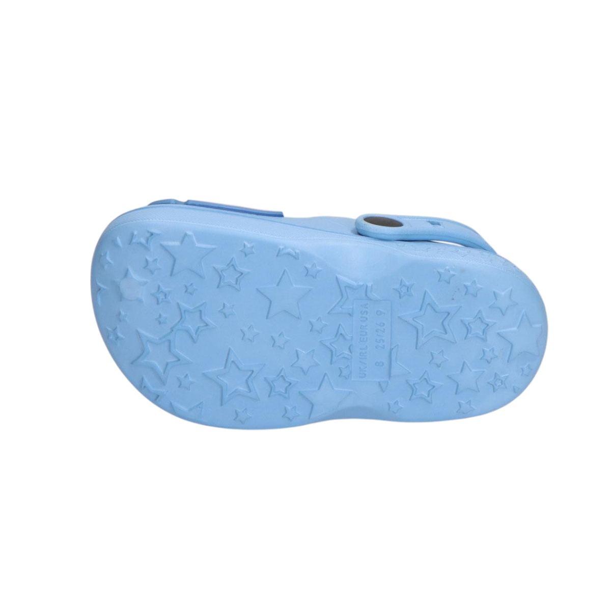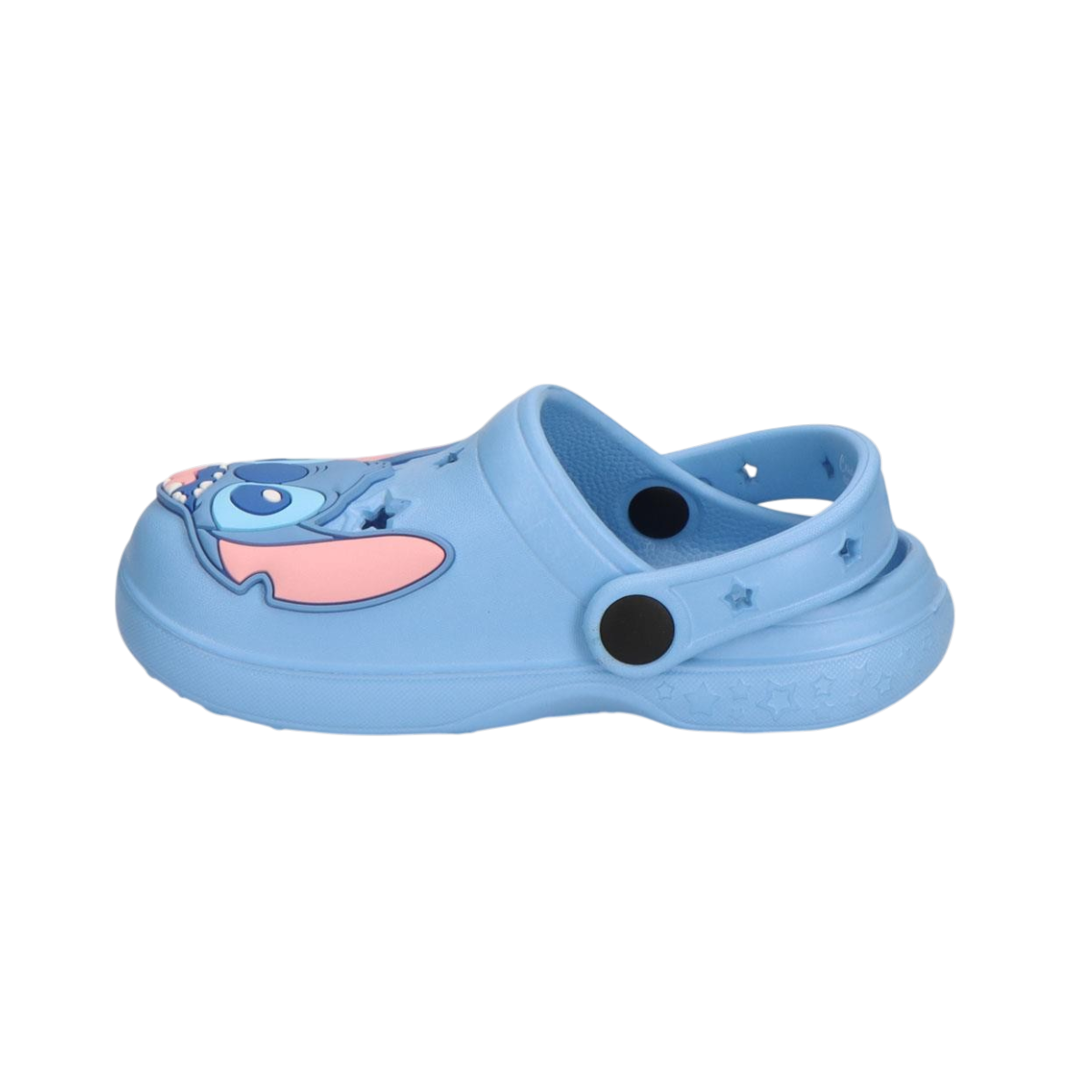Zuecos premium infantiles de Stitch en color azul, con diseño divertido que incluye pins decorativos y la cara de Stitch en la parte frontal. Un calzado cómodo, ligero y perfecto para verano.