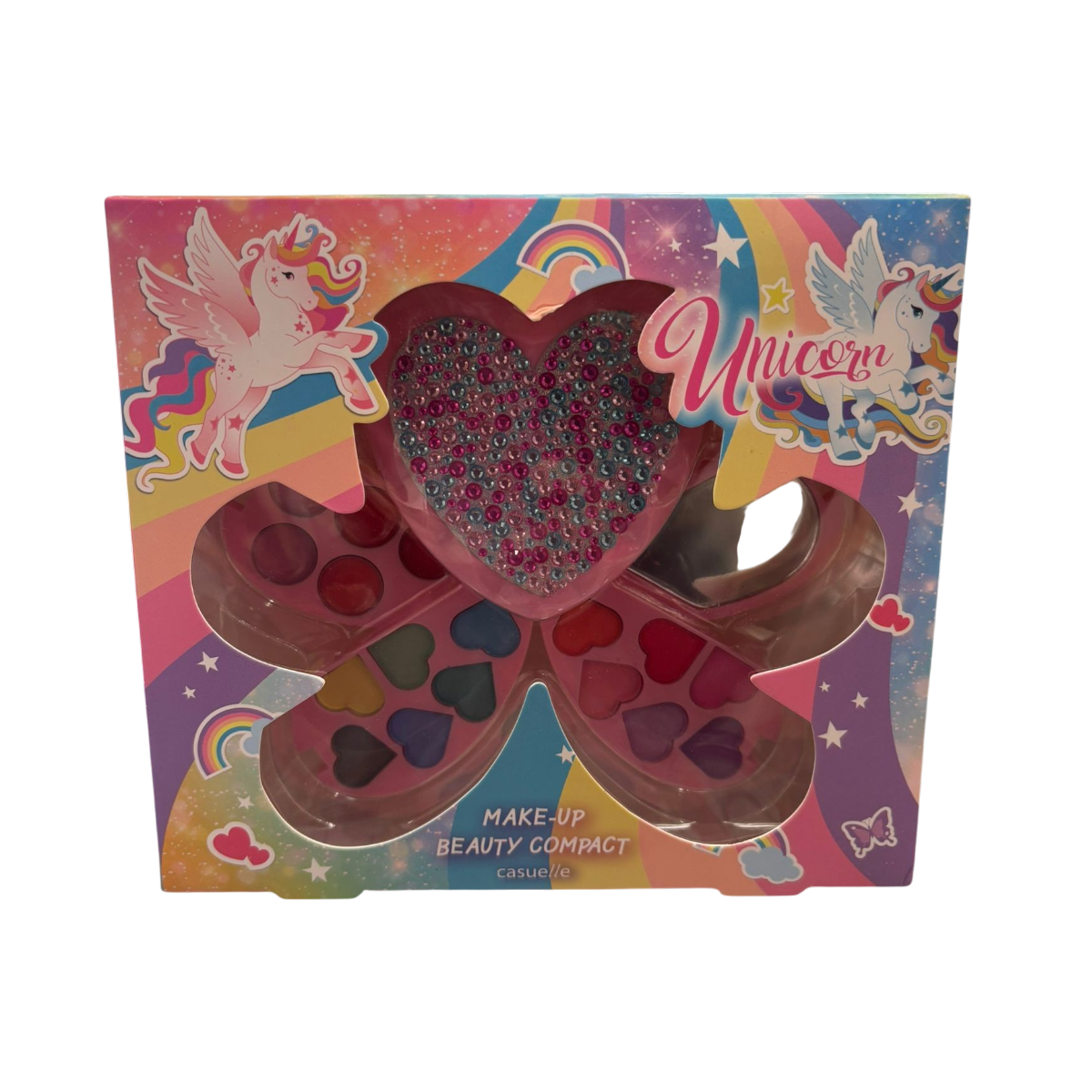 Estuche de maquillaje infantil en forma de corazón con tapa brillante. Compacto, práctico y perfecto para jugar, regalar o iniciarse en el maquillaje de forma divertida.
