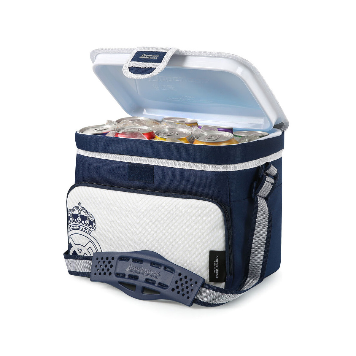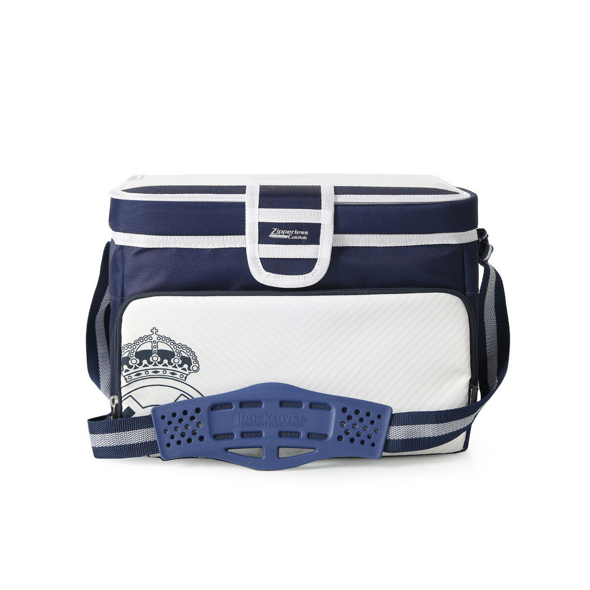 La bolsa porta alimentos del Real Madrid destaca por su diseño funcional y deportivo en tonos azul marino y blanco, con detalles inspirados en el club que aportan un estilo elegante y reconocible para los aficionados.